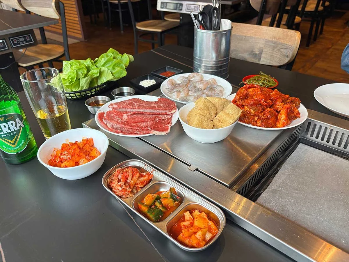 There are set menus you can opt for, giving you a choice of two meat dishes, plus a choice of sides, but it’s just as easy to create your own. We had a couple of Terra Korean beers, the waiting staff turned on the grill and handed us a card on how to use it… and away you go.