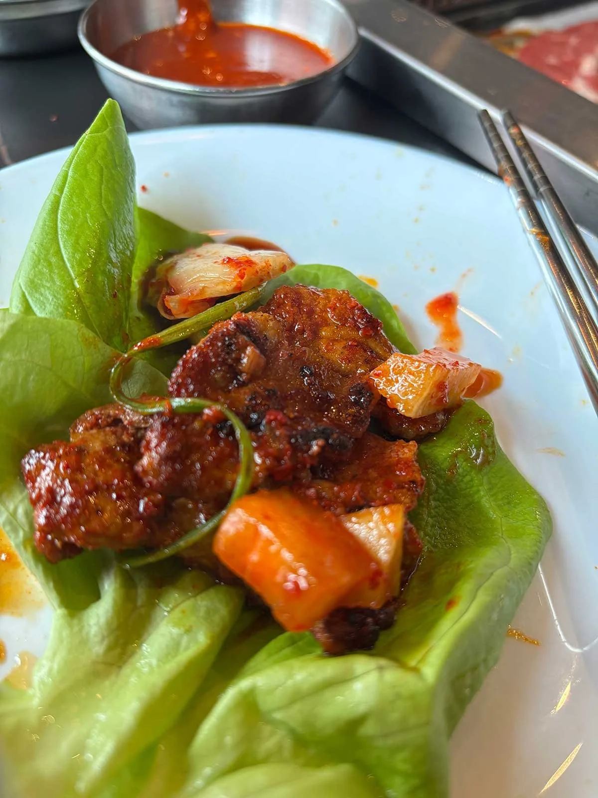 Once items are cooked, you wrap them in a green lettuce leaf (Ssam style), top with sesame oil or soy sauce and devour. Beautiful. We didn’t need it, but on the side we also ordered a classic bibimbap (£12.250), a rice dish served in a scorching hot stone bowl (dolsot), creating a crispy golden rice bottom and then topped with assorted seasoned vegetables, fried egg and sesame seeds. It was fantastic food and perfect for couples and groups. Hot.