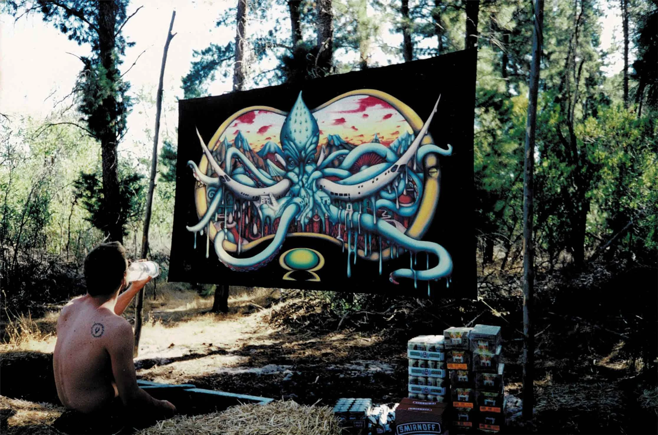 “I’ve got a photo of me just after setting up, smoking a cigarette in the bush, this big UV painting hanging behind me. Totally surreal.”
