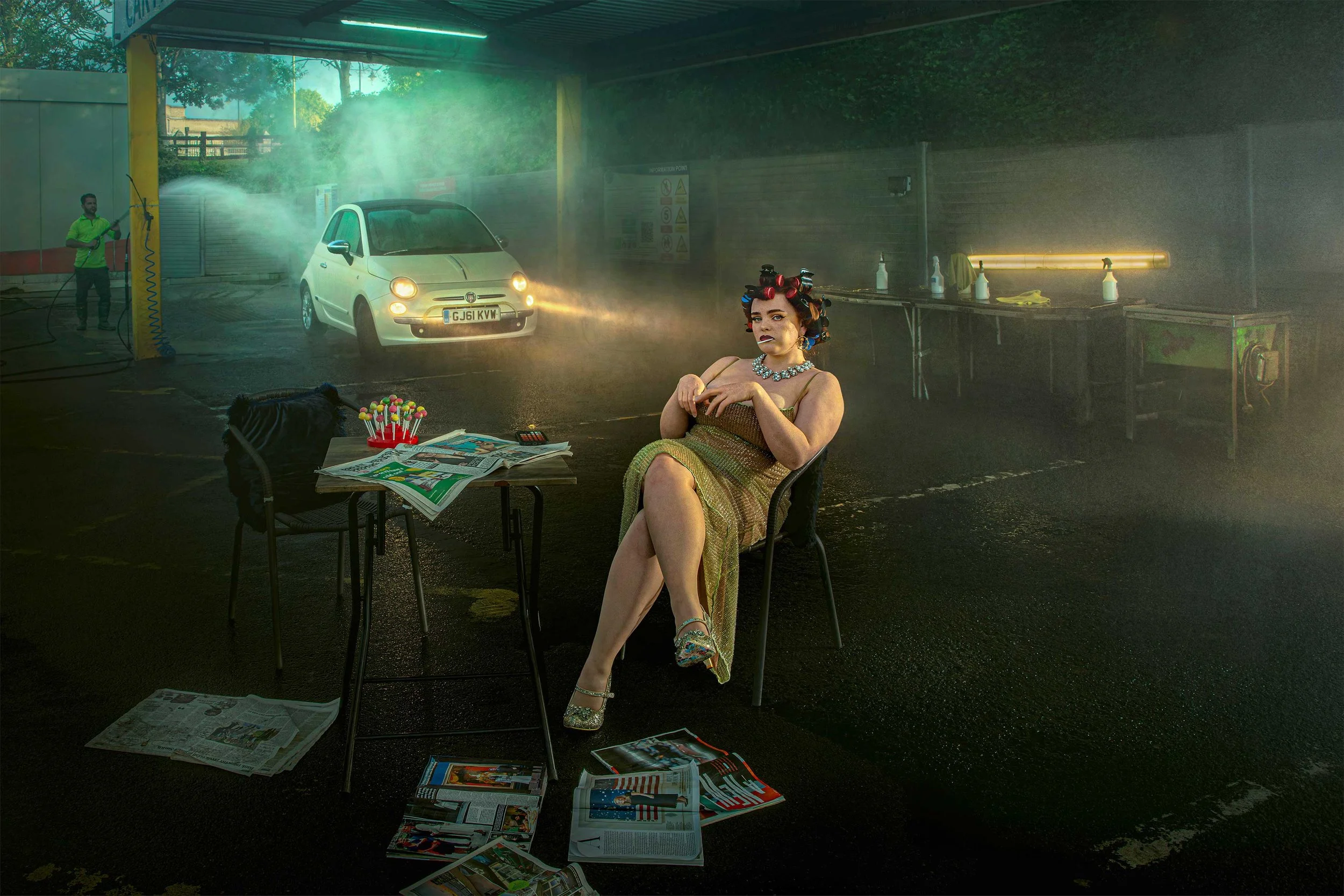 But there are echoes of photographic history in his current work, too. One image, a woman in a car-wash, nods to Terry O’Neill’s iconic portrait of Faye Dunaway after the Oscars. “It was my kind of little take on the falseness of social media,” Jason explains. “I took the swimming pool and I replaced it with a car-wash, and I took the Oscars and replaced them with lollipops… My work isn’t about being literal. It‘s just about a nod to the story and what’s going on.”