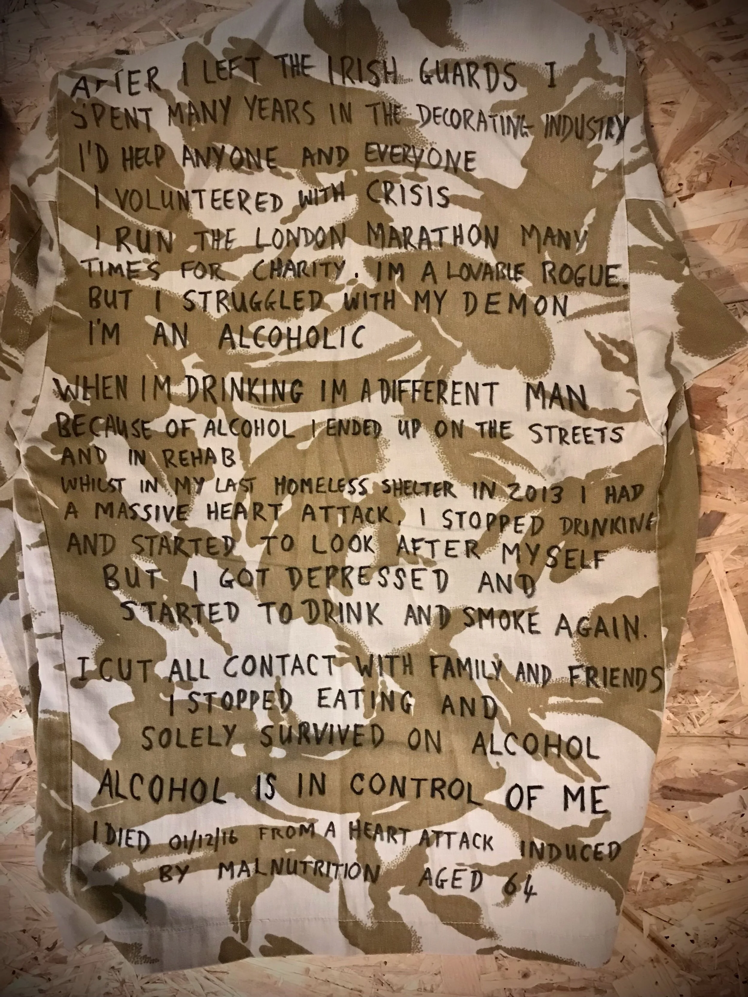 Raw and uncompromising the exhibition explores the deep-rooted questions highlighting the struggles that people face when they leave the armed forces and why life falls apart for so many ex-service personnel, leading to mental health problems, homelessness, and for some suicide. The exhibition was inspired by artist David’s own experience and tackles the subject of homelessness and the possible reality for some ex-service personnel.
